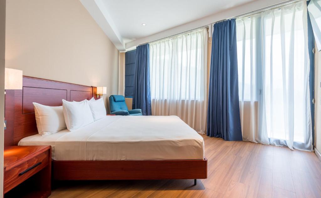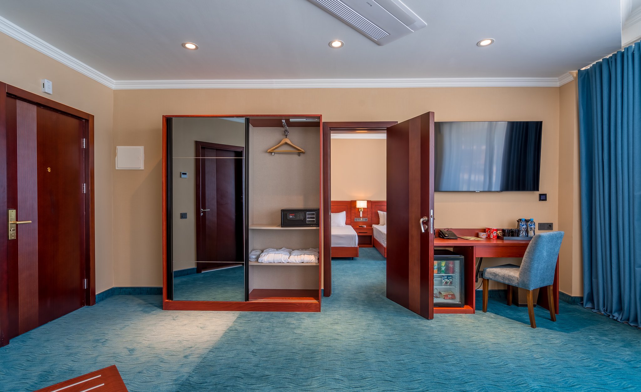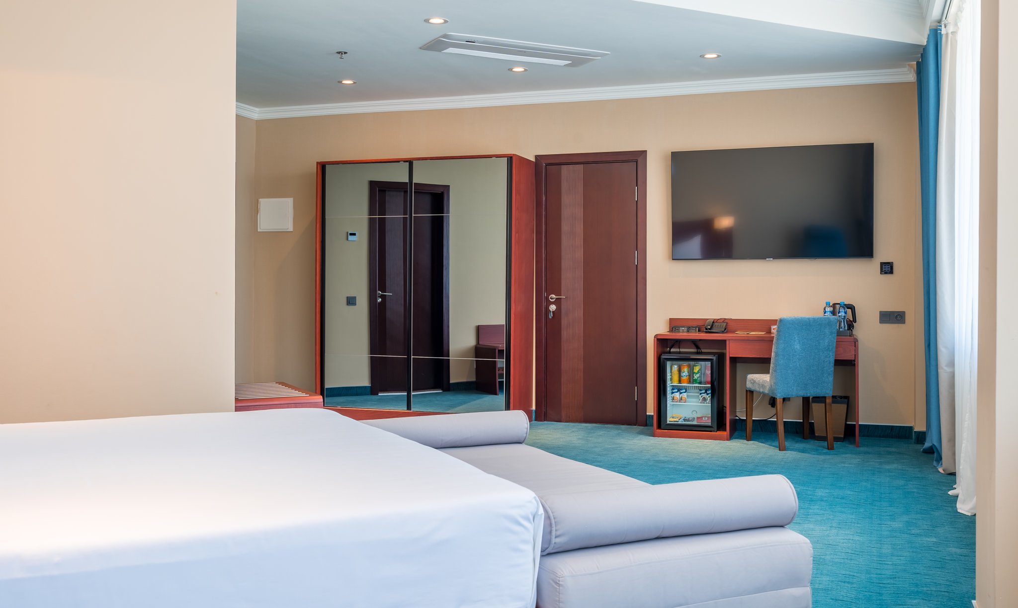 Одна жилая комната и одна спальня с большой двуспальной (190х200 см) кроватью. Размер номера позволяет использовать две дополнительные кровати размером 115 х 200 см.
